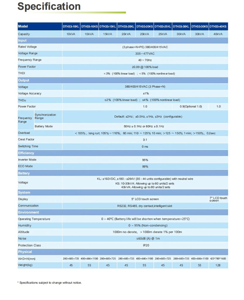 -ECO mode for energy saving -PFC technology, input power factor ≥ 0.99 -Support RS232, RS485, dry contact or SNMP