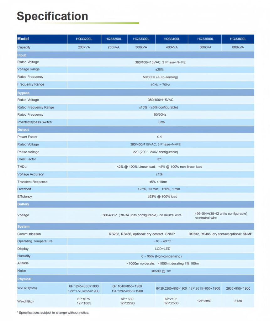 -N+1 redundant cooling system. -Built-in manual maintenance bypass switch. -Output isolation transformer. -Allowing for 3 phase 100% unbalanced load. -Isolated air duct design. -Employing phase-locked loop technology alongside electronic static bypass switch